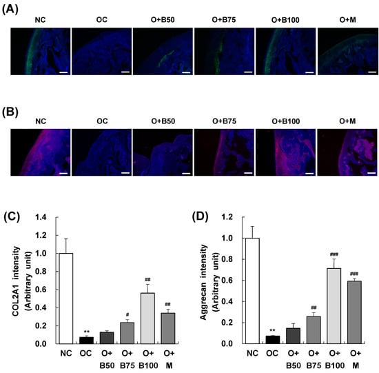 Immunofluorescence (IF) staining conducted 3 weeks post-MIA injection, specifically, on day 21, was utilized to investigate the expression of collagen type II alpha 1 (COL2A1) and aggrecan in articular cartilage tissue. The findings, illustrated in Figure 4A,B revealed a significant decrease in COL2A1 and aggrecan expression in the OC group compared to the NC group. In contrast, the O + B75, O + B100, and O + M groups exhibited relatively higher expressions of COL2A1 and aggrecan compared to the OC group, indicating a less pronounced downregulation due to OA (Figure 4C,D).