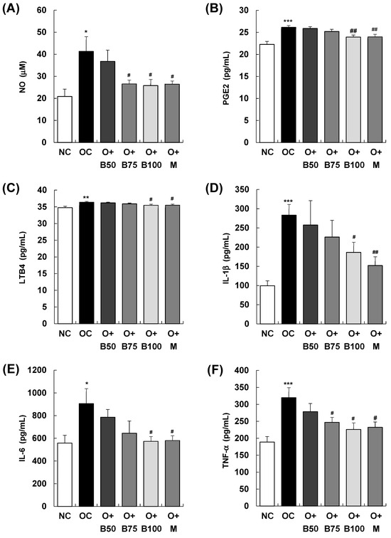 As illustrated in Figure 5, the serum concentrations of the inflammatory mediators nitric oxide (NO), prostaglandin E2 (PGE2), and leukotriene B4 (LTB4) exhibited a significant increase in the OC group compared to the NC group (p < 0.001), with measurements and sample harvesting conducted 3 weeks post-MIA injection, specifically, on day 21. In particular, Figure 5A depicts a notable reduction in serum NO content in the O + B75, O + B100, and O + M groups compared to the OC group. Similarly, Figure 5B,C illustrate significant decreases in serum PGE2 and LTB4 contents in the O + B100 and O + M groups compared to the OC group (p < 0.05). Moreover, there was a significant elevation in the serum content of the inflammatory cytokines interleukin (IL)-1β, IL-6, and tumor necrosis factor (TNF)-α in the OC group relative to the NC group (p < 0.001, p < 0.05, p < 0.001, respectively). As depicted in Figure 5D, serum IL-1β content was significantly reduced only in the O + M group compared to the OC group (p < 0.05), while Figure 5E,F demonstrate significant reductions in serum IL-6 and TNF-α contents in the O + B75, O + B100, and O + M groups relative to the OC group (p < 0.05), aligning with the timing of the post-MIA injection assessments.