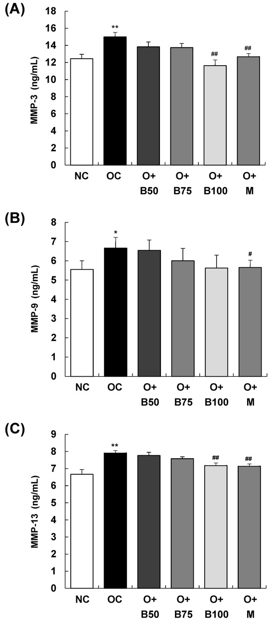 The serum concentrations of matrix metalloproteinase (MMP)-3, MMP-9, and MMP-13, measured 3 weeks post-MIA injection—specifically, on day 21—are presented in Figure 6. The OC group exhibited significantly elevated concentrations of MMP-3, MMP-9, and MMP-13 compared to the NC group (p < 0.01, p < 0.05, p < 0.01, respectively). Figure 6A,C show that the concentrations of MMP-3 and MMP-13 were significantly diminished in the O + B100 and O + M groups (p < 0.05). However, the administration of BSRE did not affect the MMP-9 content in serum in the osteoarthritis test group, as seen in Figure 6B.