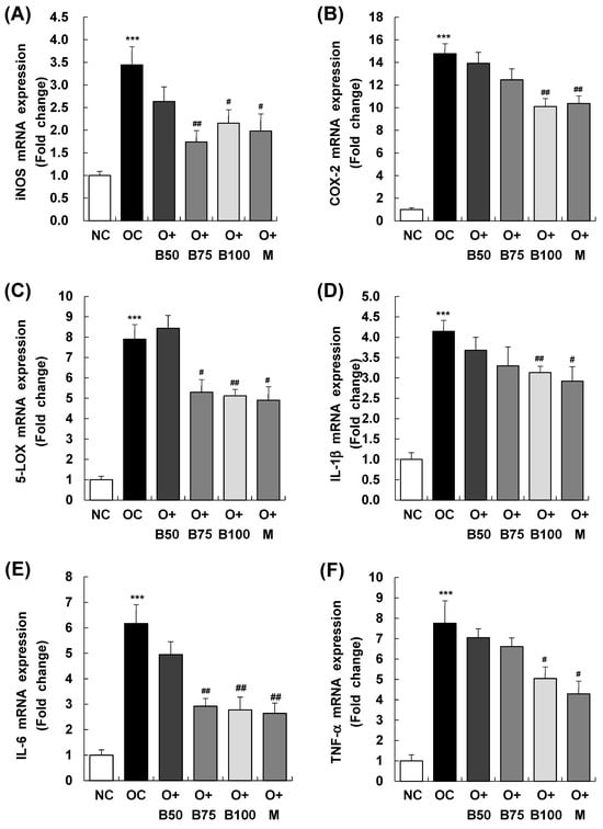 Figure 7 presents the results of mRNA expression analysis for inducible nitric oxide synthase (iNOS), cyclooxygenase-2 (COX-2), and 5-lipoxygenase (5-LOX)—enzymes responsible for the synthesis of inflammatory mediators NO, PGE2, and LTB4, respectively. These measurements and sample harvestings were conducted 3 weeks post-MIA injection, specifically, on day 21, after extracting total RNA from the knee joint synovium and conducting real-time reverse transcription polymerase chain reaction (RT-PCR). Figure 7A reveals that the OC group had a significant upregulation in iNOS mRNA expression relative to the NC group (p < 0.001). In contrast, iNOS mRNA levels were markedly reduced in the O + B75, O + B100, and O + M groups compared to the OC group (p < 0.05).