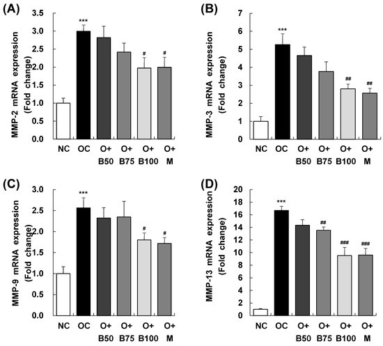 Figure 8 elucidates the results of MMP-2, MMP-3, MMP-9, and MMP-13 mRNA expression in the knee joint synovium, with measurements and sample harvesting conducted 3 weeks post-MIA injection, specifically, on day 21, to assess the effects of the treatments. Each of these expressions was notably upregulated in the OC group compared to the NC group. Within the osteoarthritis test groups, the O + B100 and O + M groups saw a marked reduction in MMP-2 mRNA levels compared to the OC group. MMP-3 mRNA levels dropped significantly in the O + B75, O + B100, and O + M groups, while MMP-9 mRNA expression decreased notably only in the O + M group. The mRNA expression of MMP-13 was significantly reduced in the O + B75, O + B100, and O + M groups compared to the OC group (p < 0.05).