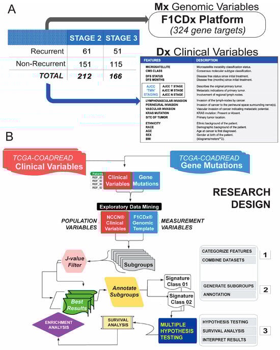 Figure 1 presents an overview of the study design and analytical workflow. Our initial dataset consisted of the F1CDx marker panel (n = 324 genes, Supplementary Table S1) corresponding to Stage 2 (n = 212) and 3 (n = 166) CRC patients. Each CRC stage included patients with recurrent (n = 61 and n = 51 for Stage 2 and 3, respectively) and non-recurrent (n = 151 and n = 115 for Stage 2 and 3, respectively) cancers. The patient characteristics are provided in Supplementary Table S2. Mutations in each panel were combined with the most relevant clinicopathological variables (Figure 1A). Panels were implemented with the use of our unsupervised data mining algorithm (XAI) [] to identify novel patient groups according to stage and recurrence. We discovered a sizable collection of subgroups of patients with Stage 2 and 3 CRC based on the pattern mining algorithm, which identified the best-performing genomic signatures in each CRC population subgroup (i.e., CRC Stage 2, CRC Stage 3 and CRC Stages 2 and 3 combined) (Figure 1B).