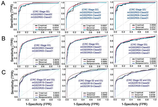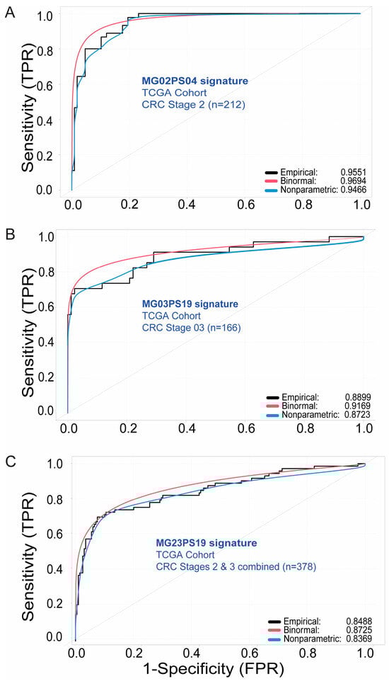 Figure 2 depicts the performance of the top genomic signatures for classifying recurrent and disease-free CRC patients in each subgroup in the training cohort (i.e., TCGA cohort). For each genomic signature, the Receiver Operating Curve (ROC) curve analysis was conducted using three different methods (i.e., empiric, binomial, and nonparametric) and the Area Under the Curve (AUC) was calculated. The genomic signature MG02PS04 (Figure 2A) showed high accuracy in distinguishing between recurrent and disease-free CRC Stage 2 patients (AUC = 0.9551, 0.9694, and 0.9466, for empiric, binomial, and nonparametric ROCs, respectively). In turn, genomic signatures MG03PS19 (Figure 2B; AUC = 0.8899, 0.9169, and 0.8723) and MG23PS19 (Figure 2C; AUC = 0.8488, 0.8725, and 0.8369) displayed high accuracy in distinguishing between recurrent and disease-free CRC Stage 3 patients and CRC Stage 2 and 3 patients combined, respectively. Remarkably, the genomic signature produced from the CRC Stage 2 subgroup outperformed those from the other CRC subgroups (i.e., Stage 3, and Stage 2 and 3 combined subgroups), and may have potential clinical applications for supplementing diagnostic protocols for CRC Stage 2 patients.