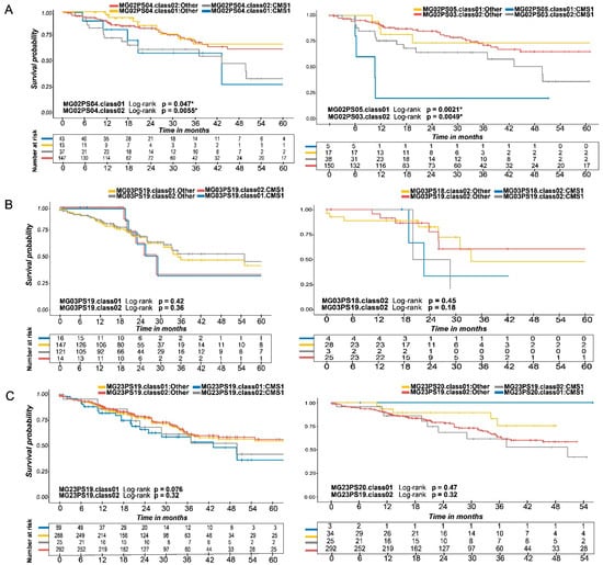 Next, we assessed the probability of disease-free survival in each subject associated with each genomic signature independently and in combination with the CMS subtype (Figure 3). For CRC Stage 2, subjects with the CMS1 subtype and mutation-positive (i.e., class 01, yellow line) or negative (i.e., class 02, red line) MG02PS04 genomic signature (Figure 3A, left panel) presented a significantly higher probability of disease-free survival (p = 0.047 and p = 0.0055 for class 01 and class 02, respectively) compared with non-CMS1 subjects bearing those genomic signatures. In turn, the CMS1 subtype subjects with the mutation-positive (i.e., class 01, blue line) MG02PS05 or mutation-negative (i.e., class 02, gray line) MG02PS03 genomic signatures (Figure 3A, right panel) had a significantly lower probability of disease-free survival (p = 0.0021 and p = 0.0049, respectively) than non-CMS1 subjects. For CRC Stage 3, the CMS1 subjects presented a lower probability of disease-free survival regardless of the mutational status of the MG23PS19 and MG03PS18 genomic signatures (Figure 3B), although the differences were not statistically significant (p = 0.42 and p = 0.36 for class 01 and class 02 MG03PS19 genomic signatures, and p = 0.45 and p = 0.18 for class 01 and class 02 MG03PS18 genomic signatures and, respectively). Similarly, we did not detect significant differences in the probability of disease-free survival when CRC Stage 2 and Stage 3 subjects were considered together, regardless of the CMS subtype or mutational status of the studied genomic signatures (p = 0.076 and p = 0.32 for class 01 and class 02 MG23PS19 genomic signatures, and p = 0.47 and p = 0.32 for class 02 of MG23PS20 and MG23PS19 genomic signatures, respectively) (Figure 3C).