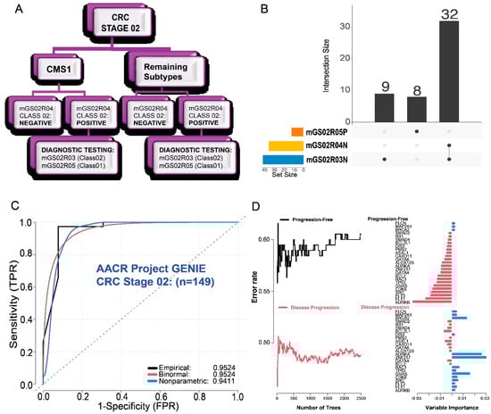 We developed a hypothetical diagnostic framework for clinical application in which we combined the three distinct genomic signatures identified as the top performers in CRC Stage 2 subjects (Figure 5A). The CRC stage and CMS1 subtype are determined by standard procedures, whereas three genomic signatures (i.e., MG02PS03, MG02PS04 and MG02PS05) can be assessed using the F1CDx assay. The comparison of the marker composition of these genomic signatures revealed a high overlap between MG02PS03 and MG02PS04, being both ‘Mutation-Negative’ (Figure 2B), with 32 shared markers between them (Supplementary Table S7 and Figure 5B). Hence, we reasoned that the shared markers in the MG02PS03 and MG02PS04 genomic signatures constitute a potential novel marker panel for tumor recurrence, with a reduction in the number of markers in the panel at minimum. To evaluate the value of this novel 32-marker panel, we validated its performance using an independent sample set (i.e., AACR GENIE BPC CRC 2.0-PUBLIC []). ROC–AUC analysis showed that the 32-marker panel had high power to predict tumor recurrence in CRC Stage 2 subjects, the empirical, binormal, and nonparametric testing metrics for the ROC curves registered AUCs resulting in: (a.) 0.9524; (b.) 0.9524; and (c.) 0.9411; respectively (Figure 5C); there were also Positive Predictive and Negative Predictive Values (PPV and NPV, respectively) of PPV = 0.9737 and NPV = 0.9231. To gain a better understanding of the molecular crosstalk represented in the 32-marker panel, we assessed the variable importance of each contributing gene. We conducted a competing risks analysis for disease-free survival using the CRC Stage 2 patients included in the AACR GENIE BPC CRC 2.0-PUBLIC dataset (Figure 5D). Out of the 32 markers within this genomic signature, 25 were provided with full clinicopathological information. For each subject, 2500 random forest survival trees were generated. Subjects with progression-free survival events demonstrated higher error rates than those exhibiting outcomes consistent with disease progression events. Of note, the lower error rates in the disease progression events are associated with the high PPV value registered for the 32-marker panel.