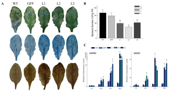 The assessment of H2O2 production in Arabidopsis was conducted using diaminobenzidine (DAB) staining. Rosette leaves from both wildtype and the L1, L2, and L3 transgenic lines were gathered at 24 h post-inoculation (hpi) and subjected to staining through a 10 min vacuum infiltration in a 2 mM DAB solution, prepared in 20 mM phosphate buffer at pH 6.0. This was followed by a 1.5 h incubation at room temperature. Afterwards, the leaves were placed in a 95% ethyl alcohol solution and incubated in a water bath at 80 °C for 20 min to clear the chlorophyll. Samples preserved in distilled water were subsequently photographed for analysis [].