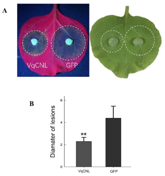 In order to investigate the role of VqCNL in plant disease resistance, we used an Agrobacterium-mediated transient transformation method to overexpress VqCNL gene in tobacco leaves aged 4–6 weeks. The recombinant PHB-eGFP vector was used as the control group and inoculated with P. capsici two days after injection to detect its disease resistance. Under UV light irradiation, the inoculated detached leaves showed obvious disease spots. P. capsici grew slower in transgenic tobacco leaves and the average disease spot diameter was significantly smaller than that of eGFP transgenic tobacco leaves (Figure 7). These results indicate that overexpression of the VqCNL gene can improve plant resistance to egg-borne pathogens.
