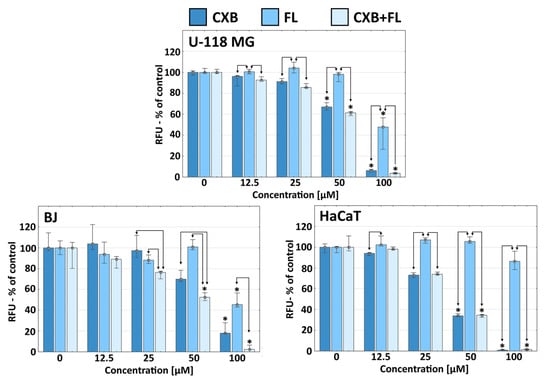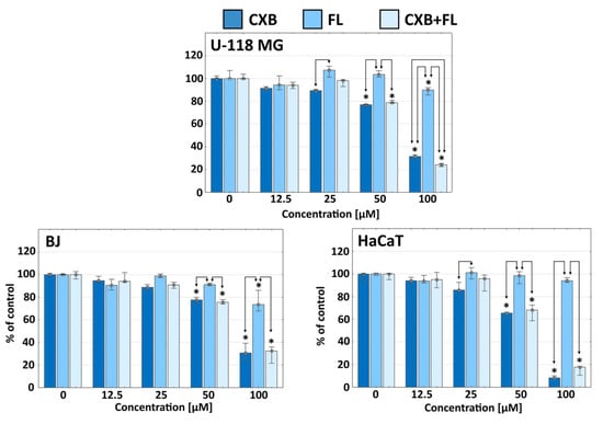 The viability of U-118 MG, BJ, and HaCaT cells after 24 h exposure for CXB, FL, or CXB+FL mixture, estimated with neutral red assay. Results are presented as medians of triplicate assays from three independent experiments, expressed as a % of non-treated controls. The whiskers are lower (25%) and upper (75%) quartile ranges. * p < 0.05; Kruskal–Wallis test (against non-treated control), arrows indicate statistical significantly differences between drugs at appropriate concentrations (U Mann–Whitney test).