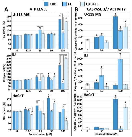 The decrease of cell viability and the associated apoptotic death process is closely correlated with fluctuations in ATP levels. Cells entering apoptosis usually increase ATP levels to prepare the necessary proteins and mechanisms involved in this process [,]. According to other sources, ATP levels may decrease rapidly in apoptotic cells []. The data quoted were reflected in the results we obtained. Glioblastoma responded predictably by increasing intracellular ATP levels at toxic 100 µM concentrations of CXB and/or FL; this increase was significantly higher in the case of CXB and the mixture of both drugs when compared to FL (Figure 3A). The pattern of changes in normal BJ fibroblasts was different. The CXB or mixture of drugs at a non-toxic 25 µM concentration caused an increase of ATP levels, but FL at a concentration of 100 µM induced a decrease (Figure 3A). It is particularly surprising that the use of both drugs induced a synergistic effect at the highest concentration, where the ATP level was 240% higher when compared to the control. The profile of energy changes in HaCaT cells was the most unpredictable. CXB increased ATP levels only at 25 and 50 µM concentrations and FL only at 100 µM, while the drug mixture increased ATP levels only at 50 µM but decreased it at the highest concentration (100 µM).