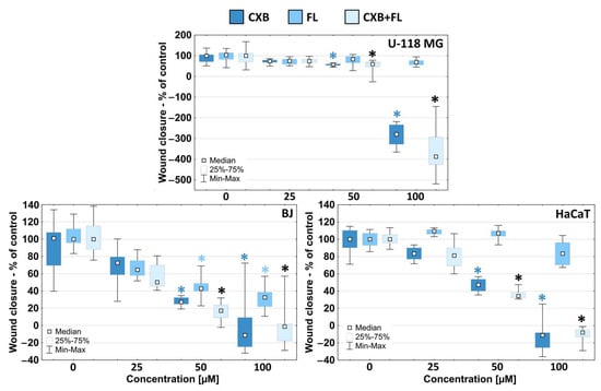 The influence of CXB, FL, or their equimolar mixture on U-118 MG, BJ, and HaCaT cells migration. Results are presented as medians of triplicate assay from three independent experiments, expressed as a % of non-treated controls. * p < 0.05; Kruskal–Wallis test (against non-treated control).