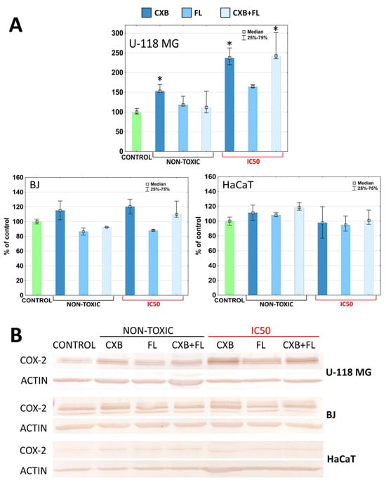 (A) The COX-2 level in U-118 MG, BJ, and HaCaT cells after 24 h treatment with CXB, FL, or CXB+FL mixture at non-toxic concentrations and IC50. Results are presented as medians expressed as percent of non-treated control. The whiskers are lower (25%) and upper (75%) quartile ranges. Symbol * shows statistically significant difference against control, p < 0.05, Kruskal–Wallis test. (B) Image of immunoblots.
