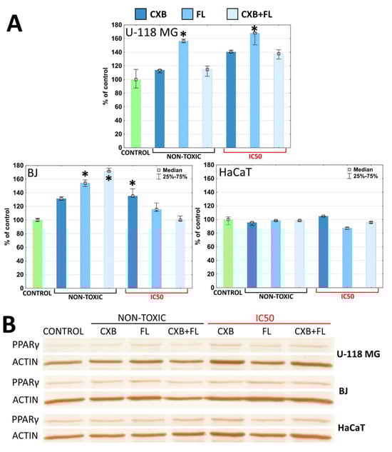 (A) Changes of PPARγ level in U-118 MG, HaCaT, BJ, and SCC-15 cells after 24 h incubation with CXB, FL, and CXB+FL mixture at non-toxic concentrations and IC50. Results are presented as medians expressed as percent of non-treated control. The whiskers are lower (25%) and upper (75%) quartile ranges. Symbol * shows statistically significant difference against DMSO-treated control, p < 0.05, Kruskal–Wallis test. (B) Image of immunoblots.