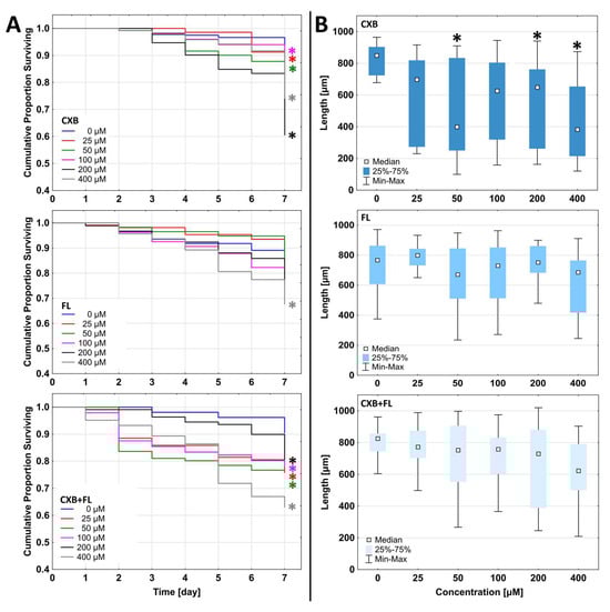 (A) The Kaplan–Meier survival curves of C. elegans during 7 days of incubation with CXB, FL, or CXB+FL. Results are presented as cumulative proportion surviving. Statistically significant differences against DMSO-treated control obtained in Gehan’s Wilcoxon test are marked with asterisks * (p ≤ 0.05) in the colors corresponding to the tested concentrations. (B) Changes of body length after 7 days treatment. Statistically significant differences against DMSO-treated control are marked with asterisks * (p ≤ 0.05, Kruskal–Wallis test).