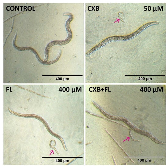 Our studies showed that CXB and FL had a negative influence on C. elegans in the range of 25–400 µM concentrations after 7 days incubation. The most active was CXB, which was toxic at 25 µM (Figure 7A). Surprisingly, the strongest impact was found at 200 µM concentration (viability lowered to 60%), but not at 400 µM (73% living individuals). During observations, it was noticed that some of the individuals exposed to CXB did not grow and their body length was significantly shorter. At 50 and 400 µM concentrations, these animals were more than twice as short as those in the control group, while those treated with 200 µM concentration of CXB showed a 25% reduction of body length (Figure 7B and Figure 8).