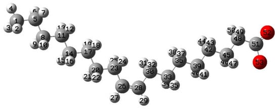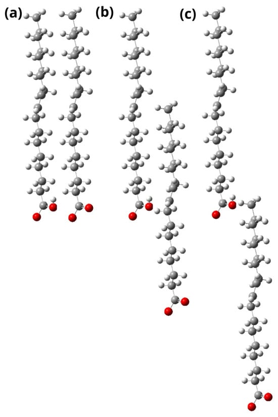 Typical forms of ionic-molecular complexes of oleic acid. (a) Head–head interaction; (b) Head–middle interaction; (c) Head–tail interaction []. Red: oxygen atoms, Grey: carbon atoms, White: hydrogen atoms.