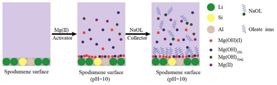 Scheme of NaOL reacting with the different elements on the surface of spodumene after being activated by Mg2+ at pH 10 [].