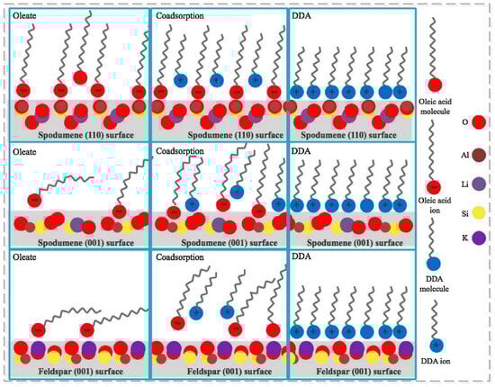 To understand the operation of this mixture of collectors, the same research team published the co-adsorption and association states of the mixture at selected spodumene and feldspar surfaces (110) and (001) to understand their adsorption characteristics. They performed micro-flotation experiments, FTIR measurements, and sum frequency vibrational spectroscopy (SFVS) and used computational tools for contact angle measurements. In the spodumene (110) surface, both anionic and cationic collectors can be adsorbed as a well-packed monolayer, and there is no significant difference when NaOL is mixed with different quantities of DDA. In the case of the spodumene (001) surface, the cation collector can also be adsorbed as a well-packed monolayer. However, in the case of the anionic collector, the adsorption is not as good as in the case of the (110) surface. Regarding feldspar, poor adsorption of NaOL was observed on the (001) surface, which improved as the ratio of DDA increased. Using DFT, it was determined that in the presence of 10% DDA, the cationic collector DDA associates first with the anionic collector NaOL to form a complex. In turn, this gives rise to a more negative charge of the active functional group COO-, and then this group chemically interacts with the Al sites at the spodumene surface, in a phenomenon called co-adsorption that can be observed in Figure 5. They concluded that using a collector mixture formed of 90% NaOL and 10% DDA is favorable enough to separate spodumene from feldspar due to the good adsorption of the anionic collector as an ordered structure that is favored by the presence of the cationic collector. The results of this mixture are explained through DFT due to the adsorption of the stable complex NaOL/DDA due to the co-adsorption states of the collector mixture [].