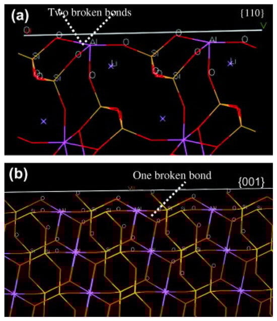 Lev Filippov and his team studied the separation behavior using fine and coarse minerals, sodium oleate as a collector, NaOH and Na2CO3 as regulators, and calcium ions as activators. The objective was to determine an optimal size range using flotation tests, XRD measurements, SEM, and zeta potential measurements. He obtained better results using a 40–80 μm range than 80–150 μm. This coincides with previous research [] that determined the highest recovery was achieved in a range of 38 to 45 μm. The zeta potential measurement reaches its most negative point at pH 10. While using the collector becomes more harmful as it reduces the positive charge of the ore surface, adding calcium ions increases recovery for both particle size ranges as the collector adsorbs at negative SiO− sites, forming a relatively dense layer. Regarding regulators, he mentioned that using NaOH increases recovery, while calcium carbonate could be detrimental and decrease performance. To understand the associated mechanism, crystallographic properties were analyzed. The adsorption of NaOL is attributed to the chemical adsorption of oleate in the exposed sites of Al and Si that are generated after breaking the Al-O and Si-O bonds. Calculating the broken-bond strength, the (110) plane is the most favorable as it is the weakest. The 40–80 μm size range has more (001) planes than the 80–150 μm range. This may be because the first range has a higher ratio between the desired planes (110) and the unwanted (100), (010), and (001) planes, so collector adsorption is preferable. They conclude that the finer particle range provides greater floatability when using sodium oleate as it exposes more planes with Al and Si sites than a coarser particle size [].