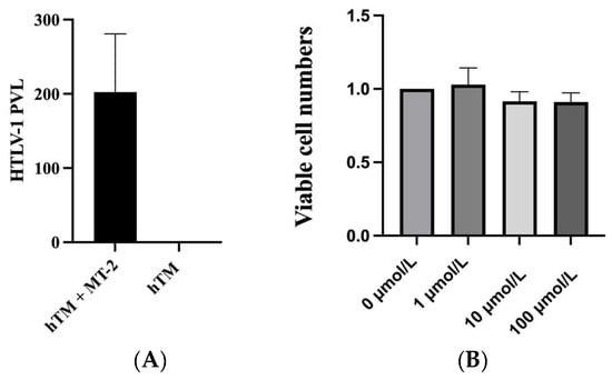We used hTM cells cocultured with irradiated MT-2 cells to build an in vitro secondary glaucoma in the HU model [,]. To confirm that hTM cells were infected, we used real-time polymerase chain reaction (PCR) to detect HTLV-1 PVL after cocultivation and three transfers. The results showed that the HTLV-1 PVL of hTM cells significantly increased after cocultivation (Figure 1A). Trypan blue staining on day 6 after irradiation showed that irradiated MT-2 cells were not viable. This result indicated that hTM cells were successfully infected after cocultivation with MT-2 and can be used as an in vitro secondary glaucoma in the HU model.