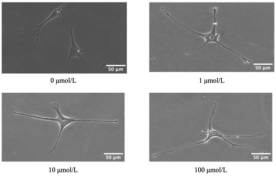 Phase-contrast microscopy was used to directly observe morphological changes in hTM cells. The results showed that hTM cells retracted under the light microscope after 60 min of treatment with ripasudil at concentrations of 1, 10, and 100 μmol/L, compared with untreated hTM cells (Figure 2). We observed that the hTM cells became thinner and smaller after ripasudil treatment.