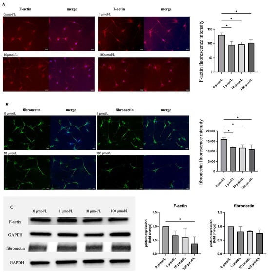To investigate cytoskeletal changes in hTM cells after ripasudil treatment, we evaluated the distribution of F-actin and fibronectin. Immunofluorescence and western blot (WB) were used to evaluate the distribution of F-actin (red) and fibronectin (green), and ImageJ software (version 1.54) was used to analyze the fluorescence intensity and WB bands of F-actin and fibronectin. The results showed that, compared to hTM cells without treatment, cells with 1, 10, and 100 μmol/L of ripasudil reduced the distribution of both F-actin and fibronectin. The detailed results are presented in Figure 3.