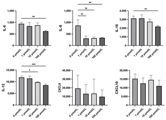 Effect of ripasudil on inflammation cytokines and chemokines. A cytometric bead array was used to detect the level of inflammation cytokines and chemokines in the supernatant of hTM cells cocultured with MT-2. Interleukin(IL)-8 decreased after treatment with 1, 10, and 100 μmol/L ripasudil (p = 0.0027, p = 0.0065, p = 0.0038, respectively). IL-6 and IL-10 decreased after treatment with 100 μmol/L ripasudil (p = 0.0080, p = 0.0091, respectively). IL-12 decreased after treatment with 10 and 100 μmol/L ripasudil (p = 0.0122, p = 0.0003, respectively). The levels of CXCL-9 and CXCL-10 did not statistically change after ripasudil treatment (*: p < 0.1; **: p < 0.01; ***: p < 0.001).