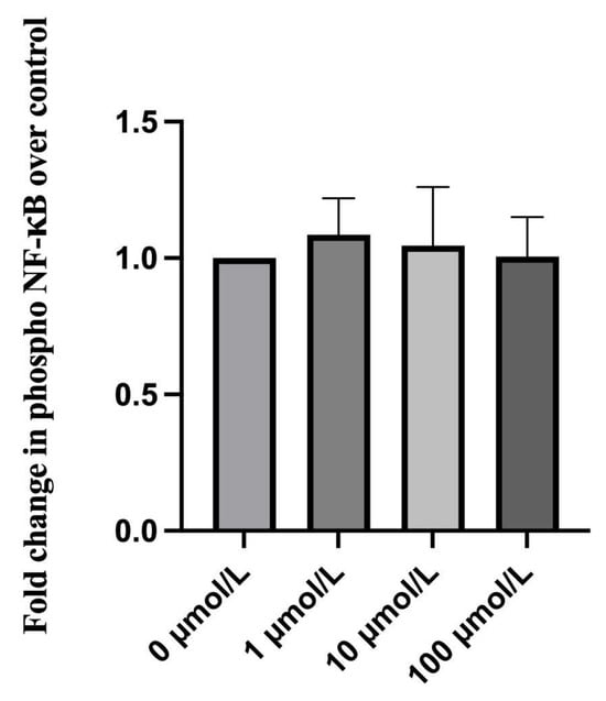 Effect of ripasudil on activation of NF-κB. An enzyme-linked immunosorbent assay was performed to detect the activation of phosphorylated NF-κB after three times transfers. After treatment with different concentrations of ripasudil, phosphorylated NF-κB activation showed no significant change.