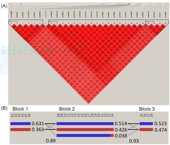 - Barrett, J.C.; Fry, B.; Maller, J.; Daly, M.J. Haploview: Analysis and visualization of LD and haplotype maps. Bioinformatics 2005, 21, 263–265. [Google Scholar] [CrossRef]