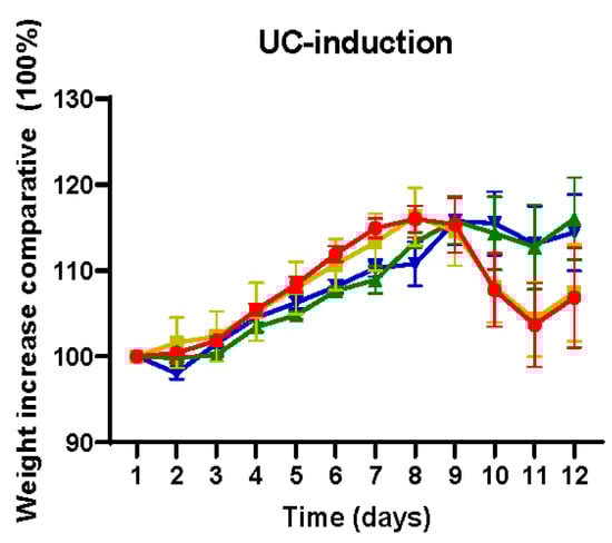 Comparison of the body weight increase in UC-induced animals from the four studied cohorts. The reductions in body weight observed around days 9 to 11 in UC-induced animals are due to the peak in UC symptoms (reduced feed ingest due to colon inflammation). Note that this reduction was minimal in luteolin and xanthohumol cohorts, thus showing a protective effect exerted by these treatments. PBS (red); apigenin (yellow); luteolin (green); xanthohumol (blue).