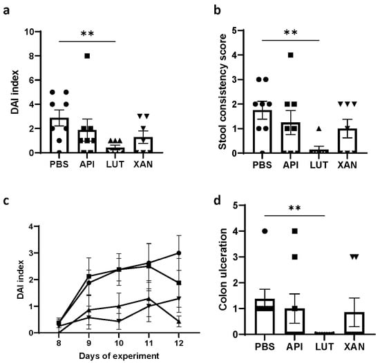 Measurements of several UC parameters in UC-induced animals from the four studied cohorts: (a) DAI index, (b) stool consistency score at day 12, (c) progression of the DAI index during the last five days of the experiment, and (d) colon ulceration at day 12. Comparisons were performed between the PBS control cohort and each flavonoid treatment cohort. In all cases, luteolin treatment showed a strong protective effect. Circle: control cohort; square: apigenin treatment cohort; upward triangle: luteolin treatment cohort; downward triangle: xanthohumol treatment cohort. Asterisks indicate statistically significant differences (** p < 0.005).