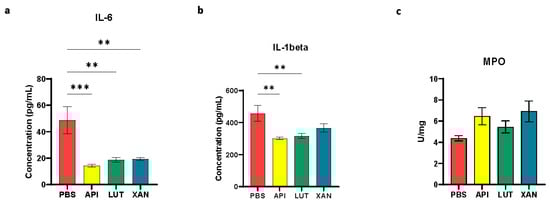 Measure of different pro-inflammatory biomarkers in UC-induced animals from the four studied cohorts: (a) IL-6, (b) IL-1β, and (c) MPO. Comparisons were performed between the PBS control cohort and each flavonoid treatment cohort. All three flavonoids demonstrated efficacy in reducing the levels of the pro-inflammatory cytokine IL-6, whereas only apigenin and luteolin exhibited effectiveness in modulating IL-1β. In contrast, flavonoids did not affect levels of MPO. PBS (red); apigenin (API, yellow); luteolin (LUT, green); xanthohumol (XAN, blue). Asterisks indicate statistically significant differences (** p < 0.005, *** p < 0.0005).
