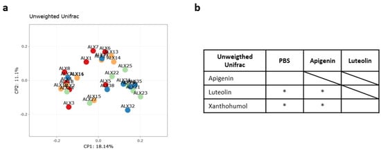 Comparisons of gut microbiota beta diversity metrics between the four studied cohorts: (a) unweighted Unifrac PCoA plot and (b) Permanova test for the unweighted Unifrac beta diversity measure. As ascertained by the unweighted Unifrac beta diversity analysis, the animals within the luteolin and xanthohumol cohorts exhibited greater similarity to each other, while they were more distinct from both the control (PBS) and apigenin cohorts. Conversely, the control and apigenin cohorts demonstrated similarity in terms of microbial community structure. In the PCoA plot, each dot represents one animal, and distances between dots represent the ecological distances between samples. PBS (red); apigenin (yellow); luteolin (green); xanthohumol (blue). Asterisks indicate statistically significant differences (* p < 0.05).