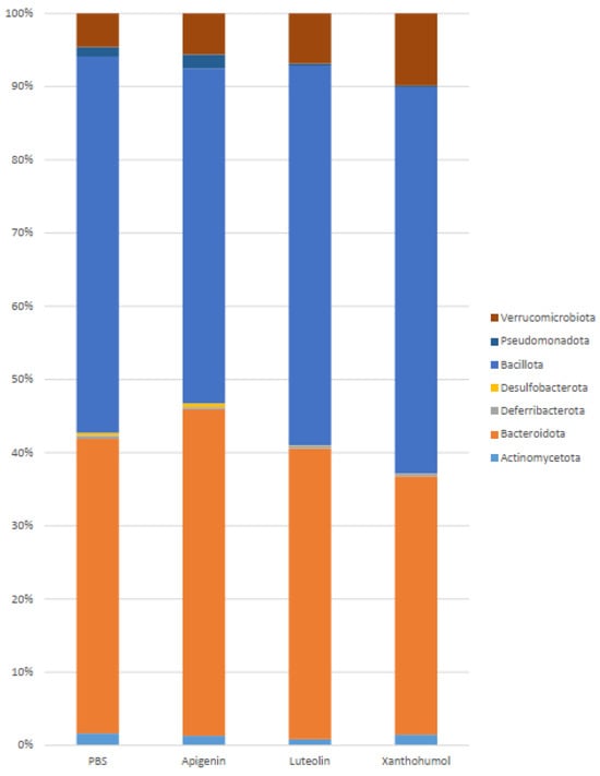 When the UC-induced animals from the PBS cohort were compared to the UC-induced animals from each flavonoid treatment cohort (Figure 5, Table 1), statistically significant differences were observed, with a significant reduction in the phylum Bacillota in the apigenin cohort (45.49% vs. 51.20% in the PBS animals), while the phylum Bacteroidota was significantly decreased in the xanthohumol cohort (34.99% vs. 40.05% in the PBS cohort). A reduction in the phylum Pseudomonadota was observed in the luteolin (0.23%) and xanthohumol (0.17%) cohorts with respect to the control cohort (1.28%). The phylum Desulfobacterota, with the genus Bilophila as its unique member, was also significantly decreased in the xanthohumol cohort (0.03% vs. 0.36% in the PBS animals). Also remarkable, and statistically significant, was the increase in the phylum Verrucomicrobiota, with Akkermansia muciniphila as its unique representative species in the xanthohumol cohort (9.77% vs. 4.56% in the PBS cohort).