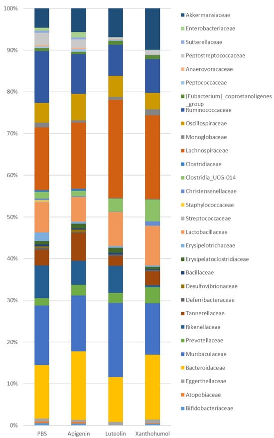 Regarding the comparisons between the three flavonoid treatment cohorts, the luteolin and xanthohumol cohorts only showed differences in the genera Alistipes, Peptococcus, and Romboutsia (Supplementary Figures S3 and S4). The apigenin cohort shared the same differences as the PBS cohort in comparison to the other two cohorts: Bifidobacteriaceae, Atopobiaceae, Rickenellaceae, Desulfovibrionaceae, Staphylococcaceae, Clostridia UCG-014, Clostridiaceae, Peptococcaceae, Peptostreptococcacee, Suterellaceae, and Enterobacteriaceae. The apigenin cohort showed main differences compared to the luteolin cohort regarding the genera Parabacteroides and Christenellaceae R7 group and compared to the xanthohumol cohort in the genus Christenellaceae R7 group.