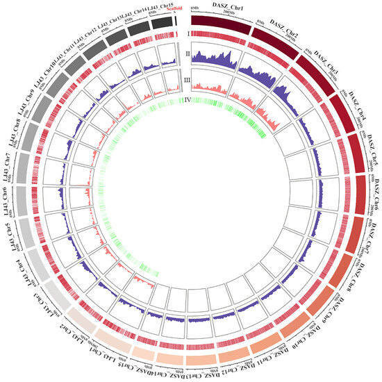Circle diagrams illustrating the distribution and density of ILP primers developed based on the ‘Shuchazao’ scaffold genome, ‘Longjing 43’ chromosome-level genome, and DASZ chromosome-level genome, respectively. The outermost circle denotes the physical size (Mb) of 1 largest scaffold of ‘Shuchazao’, 15 chromosomes of ‘Longjing 43’ and 15 chromosomes of DASZ, each indicated by different colors. Circles I and II show the distribution positions and densities of designed ILP primers, respectively. Circles III and IV show the distribution density and location of developed ILP Makers, respectively.
