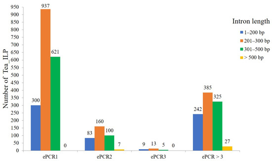 After ePCR analysis, a total of 3214 tea ILP markers (Table S1) were developed through the three tea tree genomes. Among these markers, 1858 primer pairs produced a single band, 350 primer pairs generated two bands, 27 primer pairs yielded three bands, and 979 primer pairs resulted in more than three bands (Figure 2). Notably, there were 1495 introns with lengths ranging between 201–300 bp, followed by 1051 introns with lengths of 301–500 bp, and 634 introns of 1–200 bp. The number of introns with lengths greater than 500 bp was the lowest, with only 34.