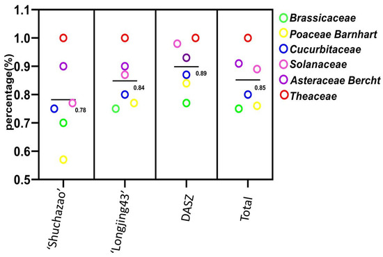Figure 3 illustrates that 35 primer pairs (Table S3) had the ability to be transferred across 11 plant species of 6 families, with an average commonality amplification ratio of 0.85. All 35 tea ILP markers showed a 100% cross-transferability rate in C. reticulata. Tobacco, sunflower, wheat, tomato, cucumber, oilseed rape, and pepper all had a cross-transferability rate greater than or equal to 80%, while rice, Arabidopsis thaliana, and maize all had a cross-transferability rate of more than 60%. The tea ILP markers also demonstrated varying cross-transferability rates through the six families. Theaceae had the highest cross-transferability rate at 100%, followed by Asteraceae Bercht with 91.43%. Solanaceae, Cucurbitaceae, and Poaceae also displayed high cross-transferability rates, at 88.57%, 80.00%, and 76.19%, respectively. The cross-transferability rate was lowest in Brassicaceae, with 75.71%. The average cross-transferability rate of Tea ILP markers through the six families was 85.17%. Furthermore, the markers developed using the three different approaches exhibited transferability among the 11 species, with an average transferability rate of 89.83% for markers developed based on the DASZ chromosome genome of the ancient tea tree, 84.83% for markers developed based on the ‘Longjing 43′ chromosome genome, and 78.17% for markers developed based on the scaffold genome of ‘Shuchazao’.
