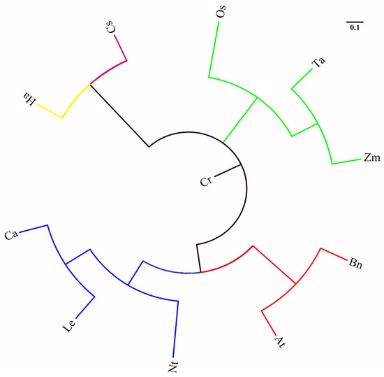 Genetic relationships of 11 plant species as determined by 35 ILP molecular markers. Cr (C. reticulate), Os (Oryza sativa), Ta (Triticum aestivum), Zm (Zea mays), Nt (Nicotiana tabacum), Le (Lycopersicon esculentum), Ca (Capsicum annuum), At (A. thaliana), Bn (Brasscia napus), Ha (Helianthus annus), Cs (Cucumis sativus).