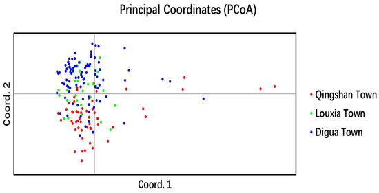 Figure 7 displays the outcomes of the PCoA (principal coordinate analysis) applied to cultivated C. tetracocca trees in Puan. The analysis unveiled an initial clustering of cultivated trees within each region, with overlapping clusters attributed to frequent gene exchange between them. In comparison to the cultivated tea tree populations in these three regions, the cultivated C. tetracocca populations in Louxia Town and Digua Town exhibited a closer genetic relationship. These findings align with the results obtained from the cluster analysis and STRUCTURE analysis.