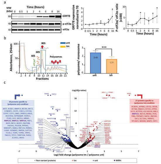 Polysome composition is modified under ER stress. (a) AC16 cardiomyocytes were subjected to tunicamycin treatment, and the ER stress time-course (0 h, 30 min, 1 h, 2 h, 4 h, 6 h, 8 h, 16 h) was carried out by analyzing eIF2α phosphorylation and GRP78 expression using capillary electrophoresis. GRP78 expression was quantified by normalization to 0 h time point (middle panel). EIF2α phosphorylation was quantified by measuring the ratio of P-eIF2α/total eIF2α for each time point (right panel). Experiments were reproduced 5 times and statistics performed with a non-parametric Mann–Whitney test, * p < 0.05 (Table S1a,b). (b) Proteins were purified from polysomal fractions of untreated or tunicamycin-treated (4 h) AC16 cardiomyocytes (Table S1c–e). Cytosolic lysate was purified on a sucrose gradient. P/M ratio (polysome/monosome) was determined by delimiting the 40S-60S-80S and polysome peaks and taking the lowest plateau values between each peak and by calculating the area under the curve (AUC). Then the sum of area values of polysome peaks was divided by the sum of the area of the 40S, 60S and 80S peaks. Experiments were reproduced 5 times, and the mean ± SEM is represented in the histogram. The P/M ratio of stressed cells condition was compared to unstressed condition using a non-parametric Mann–Whitney test, *** p < 0.001. (c) Proteins purified from polysomal fractions were identified and quantified using a label-free quantitative mass spectrometry approach (Table S2). A volcano plot showing proteins significantly expressed in polysomal fractions of untreated cells (blue) and tunicamycin-treated cells (red) is presented. An unpaired bilateral Student’s t-test with equal variance was used. Variant significance thresholds are represented by an absolute log2-transformed fold change (FC) greater than 1 and a −log10-transformed (p-value) greater than 1.3 (dotted lines). The detailed list of proteins determined specifically detected in one of the conditions is given (blue and red boxes). Mitochondrial ribosomal proteins (MRPs) with significant variations are indicated in purple.