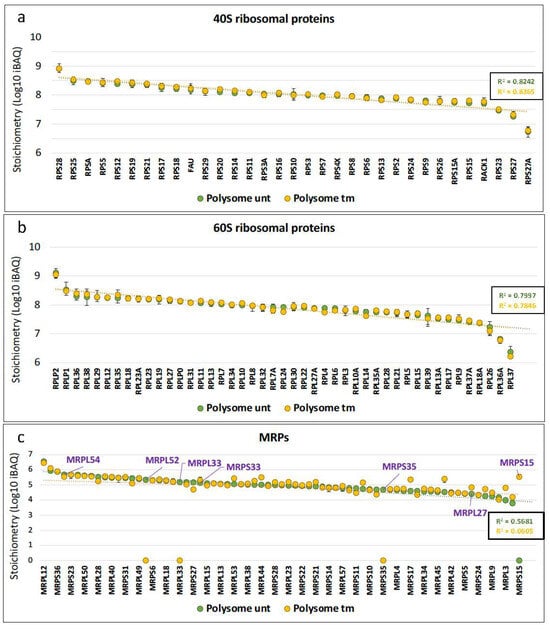 ER stress induces MRP stoichiometry variations in polysomal fractions. The relative stoichiometry of ribosomal proteins and mitochondrial ribosomal proteins in polysomes of AC16 cells was estimated from the data of Figure 1 by using the intensity-based absolute quantification (iBAQ) values in untreated (unt) versus tunicamycin-treated (tm) cell polysomes. The dotted line corresponds to the trend curve with the coefficient of determination (R2) in each condition. (a) 40S RPs, (b) 60S RPs, (c) mitochondrial ribosomal proteins. MRPs with statistically significant variation in the differential analysis are indicated in purple. On the abscissa axis MRPs are in the order provided in Table S2, but only one out of two names are indicated for a better visibility (Table S2).