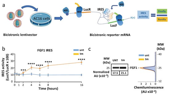 Female human embryonic HEK-293FT kidney cells (Invitrogen R700-07, Waltham, MA, USA), used to produce lentivectors, were cultivated in DMEM-GlutaMAX + Pyruvate (Life Technologies SAS, Saint-Aubin, France), supplemented with 10% fetal bovine serum (FBS) and MEM essential and non-essential amino acids (Sigma-Aldrich, St. Louis, MO, USA). Human ventricular AC16 cardiomyocytes (ATCC CRL-3568TM), used in all experiments, were cultivated in Dulbecco′s Modified Eagle′s Medium/Nutrient Mixture F-12 Ham containing 12% FBS, Penicillin/Streptomycin (100 U/mL–100 μg/mL) and 2 mM L-Glutamine. All cells were cultivated in a humidified chamber at 37 °C and 5% CO2. Endoplasmic reticulum stress induction medium was replaced by AC16 medium containing 2 µg/mL of tunicamycin. Dose and time of treatment were based on a previous study [29]. However, the appropriate conditions for treating AC16 cells were determined with a time course (Figure 1a and Figure 4c). IRES activation was the parameter that determined the time of stress. Increase of the ER stress marker GRP78 was the parameter used to choose the time of stress.