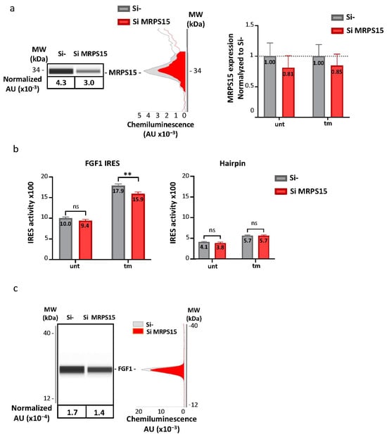MRPS15 knock-down inhibits FGF1 IRES activity under ER stress. (a) AC16 cells were transfected with MRPS15 siRNA, and protein extinction was measured after 48 h by capillary electrophoresis Simple Western. A representative capillary electrophoresis and a histogram showing the mean ± SEM of 6 independent experiments are shown. (b) FGF1 IRES activity and hairpin control activity were obtained by measuring firefly/renilla ratio; the experiment was performed 4 times with 3 biological replicates (n = 12) for the FGF1 IRES and 3 times (n = 9) for the hairpin (Table S8). Data were pooled and shown in a histogram corresponding to the mean ± SEM. Data of SiMRPS15 transfection were compared to corresponding Si control with a 2-way ANOVA test; ** p < 0.01, ns: non significant. (c) Endogeneous FGF1 expression was analyzed by capillary electrophoresis. A representative capillary electrophoresis and a histogram showing the mean ± SEM of 6 independent experiments are shown (Table S8).