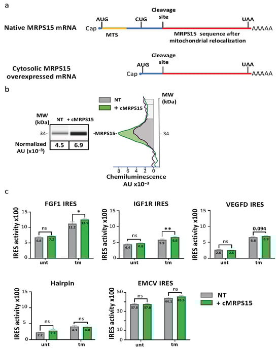 Cytosolic MRPS15 overexpression increases FGF1 and IGF1R IRES activities under ER stress. (a) Schematic representation of endogenous MRPS15 mRNA and of cytosolic MRPS15 mRNA used for cMRPS15 overexpression. A lentivector coding this cMRPS15 expression cassette was constructed and produced. (b) AC16 cells were transduced with the lentivector overexpressing cMRPS15 and with bicistronic IRES-containing lentivectors (FGF1, IGF1R, VEGFD, AMCV IRES of hairpin control). MRPS15 expression was measured by capillary electrophoresis; a representative experiment and a histogram showing the mean ± SEM of 3 independent experiments is shown. (c) IRES activity was obtained by measuring firefly/renilla ratio; each IRES experiment was performed at least 3 times with 3 biological replicates (n ≥ 9), and IRES activity of MRPS15 overexpression was compared to WT in corresponding conditions (untreated or treated tunicamycin) using a 2-way ANOVA test (Table S9); * p < 0.05, ** p < 0.01, ns: non-significant.
