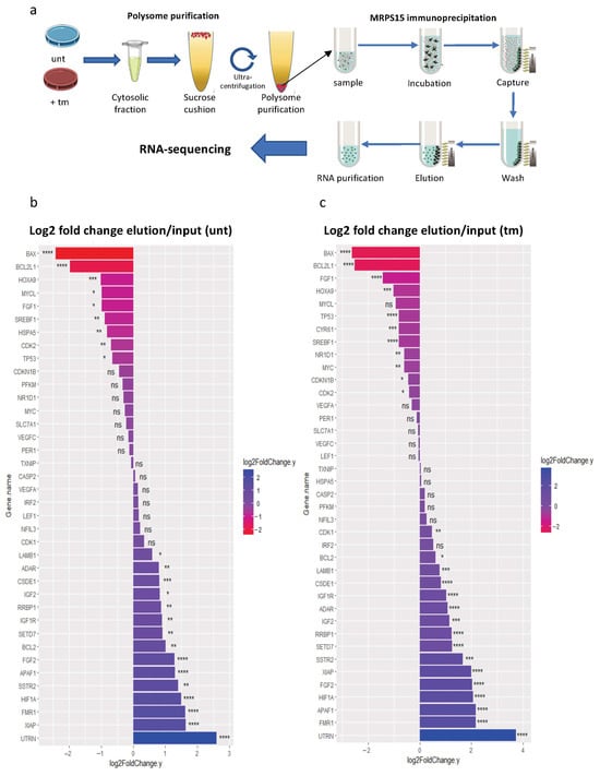 Ribosomes containing MRPS15 are more associated with IRES-containing mRNAs under ER stress. (a) Schematic representation of MRPS15 polysome immunoprecipitation profiling. (b,c) IRES-containing mRNA fold change (log2) of MRPS15 elution versus input samples from untreated (b) or tunicamycin-treated cells (c). Data represent 3 independent biological replicates for each condition (Table S10); * p < 0.05, ** p < 0.01, *** p < 0.001, **** p < 0.0001, ns: non-significant.