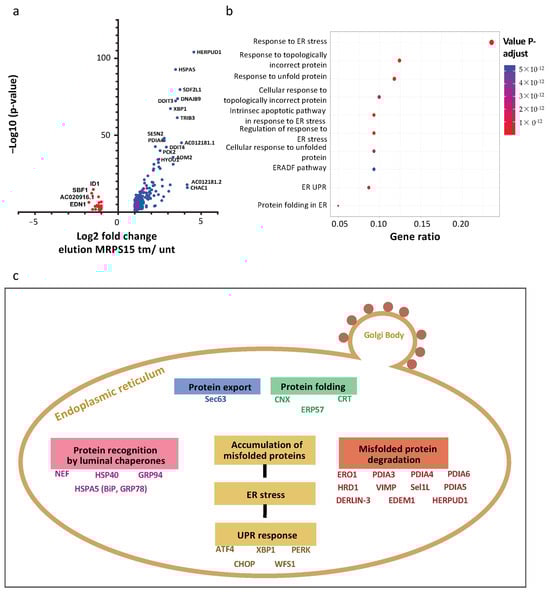 AC16 ribosomes containing MRPS15 are specialized in UPR mRNA translation. (a) Volcano plot from polysome-IP profiling showing RNAs significantly enriched in MRPS15 elution in tunicamycin-treated cells (blue) and MRPS15 elution in untreated cells (red). (b) The biological process of RNAs identified at a significant level in MRPS15 elution (tm-treated) was analyzed using enrichGO with R software (ClusterProfiler 4.10.0) and presented in a dot plot. (c) The most represented biological processes were analyzed using enrichKEGG with R software, and the complete pathway of proteins coded by mRNAs found significantly enriched in MRPS15 elution tm is shown.