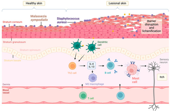 Common allergens in AD include the bacteria Staphylococcus aureus (S. aureus) [8] and the fungus Malassezia sympodialis, which show dominance in AD skin [7]. These allergens penetrate the damaged skin to trigger the Th2 immune response, whose excessive activation causes AD [5]. The immunopathology of AD, highlighting the role of both immune cells and infection, is presented in Figure 1. Specifically, Th2 activation occurs after dendritic cell (DC) presentation of allergens to naïve T cells, which leads to the secretion of the type 2 cytokines IL-4, IL-5, and IL-13. These induce immunoglobulin E (IgE) antibody class switching in B lymphocytes and the production of antigen-specific IgE. The antibodies enter the circulation and bind to receptors on mast cells and basophils, causing degranulation: the release of histamine, cytokines, and further mediators [2]. In addition to DCs and T cells, macrophages are also involved in the immunopathology of AD, as they are recruited to the diseased tissue and differentiate into various phenotypes. Classically activated macrophages, also called pro-inflammatory M1 cells, are induced by IFN-γ and have a high capacity to present antigens. In contrast, alternatively activated macrophages, also called anti-inflammatory M2 cells, are induced by IL-4, and they promote Th2 responses. Unsurprisingly, there is a significant increase in M2 macrophages in the skin of patients with AD compared with healthy donors, whilst there are no clear changes in M1 infiltration in skin samples of patients with AD [9,10].