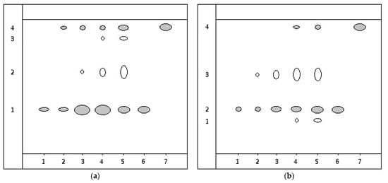 Chromatogram diagram of extraction from the root: (a) Taraxacum officinale, (b) Arctium lappa: on the start line of point 1—2 µL of extraction; point 2—3 µL; point 3—5 µL; 4—7 µL; point 5—10 µL; point 6—3 µL 0.1% standard rutin solution; point 7—3 µL 0.1% standard quercetin solution.