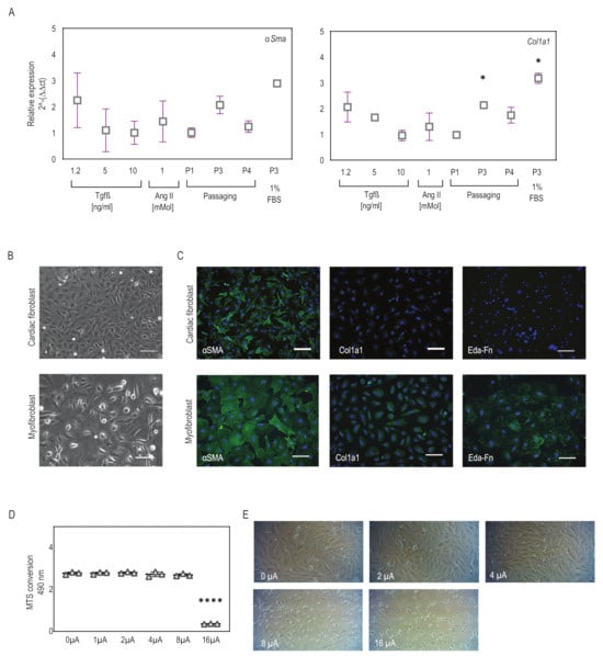 Myofibroblasts differentiate and microcurrent treatment setup. (A) Expression of myofibroblast markers αSma and Col1a1 was observed in all conditions, indicating successful differentiation. Slightly higher expression was observed in the P3 + 1% FBS condition. Plot graphs present replicates and mean ± SD (n = 2–5). * p < 0.03. (B) Phase-contrast images reveal elongated and spread morphology upon differentiation to myofibroblasts. (C) Immunofluorescence staining for the myofibroblast markers αSma, Cola1a1, and Eda-Fn (green) comparing cardiac fibroblasts to differentiated myofibroblasts (P3 + 1% FBS condition). DAPI (blue) marks cell nuclei. Scale bars, 100 µm. (D,E) Cell viability assay for cardiac cells subjected to microcurrent application ranging from 0 to 16 µA/cm2 direct current. (D) The plot graph shows the effect of current densities on cell viability. Plot graphs present replicates and mean ± SD (n = 3). ns < 0.1, **** p < 0.0001. (E) The representative phase-contrast images display variations in cell density and instances of cell detachment and floating cells across the varying current densities.
