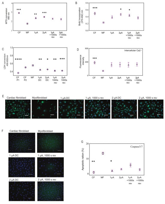 To determine the optimal microcurrent dosage, cardiac fibroblasts were subjected to current dosages ranging from 0 to 16 µA/cm2 DC, and cell viability was assessed. Subsequently, to initiate microcurrent treatment, differentiated myofibroblast cells were plated at a density of 50,000 cells per well on gelatin-coated 24-well dishes (Corning CoStar, VWR). The following day, microcurrent was applied via the electrodes placed directly in the cell culture medium. Electric current was applied as 1 µA/cm2 DC, 2 µA/cm2 DC, 1 µA/cm2 DC with 1000 s polarity reversal, or 2 µA/cm2 DC with 1000 s polarity reversal for 72 h each. Medium change was performed every 24 h. In this study, cardiac fibroblasts (CFs) function as the control group, representing healthy cells, while myofibroblasts (MFs) serve as the baseline control, representing the diseased state.